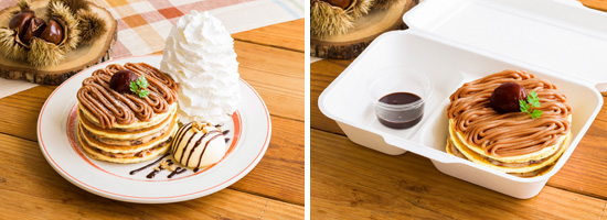 毎年人気のモンブランクリームをたっぷりのせたパンケーキ!生地に重ねたクリームは2種類の味から1つお選びいただけます。