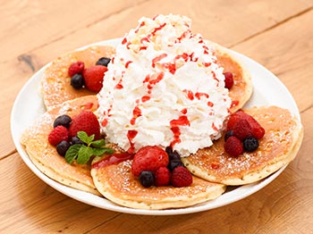 Eggs ’n Things自慢のパンケーキに4種のフルーツ(いちご・バナナ・ブルーベリー・パイナップル)と3種のソース(チョコレート・ラズベリー・マンゴー)をトッピング。