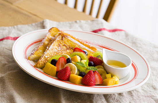 たっぷりのフルーツと共に楽しめるフレンチトースト。イチゴ・ブルーベリー・バナナ・キウイ・パイナップル・マンゴーがふんだんに添えられており、この一皿で1日分のフルーツ摂取量をカバーできます。フレンチトーストのほのかな甘味にフレッシュフルーツが加わり、ハウオリ(幸せ)な味わいです。また、お好みでハチミツをかけることでより深い、リッチな味の変化も楽しめます。ビタミンCもしっかり摂取できて、お肌にも嬉しい一品です。