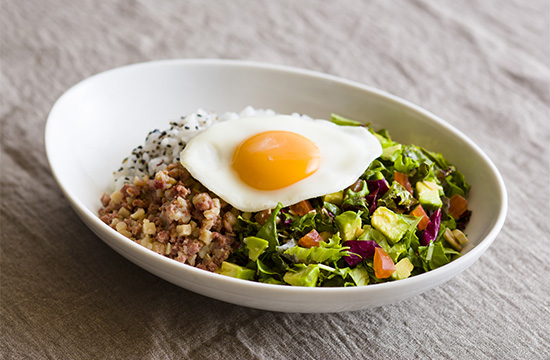 五穀米の上にたっぷりのサラダをのせた食べ応え抜群のサラダボウル。口当たりのよいクリーミーでほのかな酸味のドレッシングとオニオンの甘み、コーンビーフハッシュが絶妙にマッチした味わいです。この一皿で16品目もの食材を使用し、1日に必要な野菜の摂取量を3分の1カバーできる一品です。