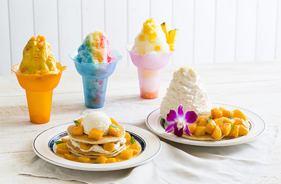 香りと甘みが強いマハチャノック種のマンゴーをふんだんに使用した、『マンゴーレアチーズパンケーキ』、『マンゴーマンゴーパンケーキ』の2種類と、Eggs ’n Things初のかき氷メニューの第3弾として『マンゴーシェイブアイス』の3品が登場いたします。