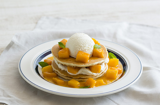 香りと甘みが強いマハチャノック種のマンゴーを贅沢にはさんで自家製レアチーズとパンケーキをミルフィーユ状に盛りつけた大人リッチなパンケーキです。マンゴーの甘味と濃厚なコクとまろやかな酸味のあるレアチーズは相性抜群で爽やかなハーモニーを楽しめます。
