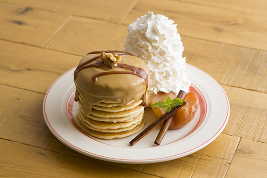 商品名:『カフェラテパンケーキタワー、焼きリンゴ添え』価格:1,500円(税別)