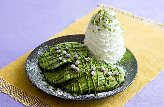 Eggs ’n Thingsでは10月1日(火)より、ハワイをはじめ海外でも人気の高い抹茶を使った『宇治抹茶、ホイップクリームとレッドビーンズ(あずき)』を新たにグランドメニューとして追加し販売を開始いたします。抹茶を練り込んだ芳醇な味わいのパンケーキに、抹茶ソースと北海道産の大納言あずきを盛り付けました。抹茶本来の薫りと味わいを楽しめる一皿をご堪能下さい。