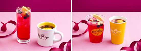 毎年人気のバレンタイン限定パンケーキ!今年の『フォンダンショコラパンケーキ』は、チョコレートに包まれたココア生地からストロベリーピューレが流れ出す一皿です。チョコレートの甘みとストロベリーの甘酸っぱさで最後のひと口まで美味しくお召し上がりいただけます。苺やナッツ、チョコレートホイップクリームとお楽しみください。爽やかな酸味があるドリンク『クランベリーサングリア(ノンアルコール)』はパンケーキと相性抜群です!また、寒い季節にぴったりな温かい『クリーミーブロスエッグス』も登場!旨味が凝縮されたブロス(ブイヨン)ベースのスープにクリームを加えたコクのある味わいのスープライスです。香ばしく焼き上げたグリルドチキンがさらに食欲をそそります。
