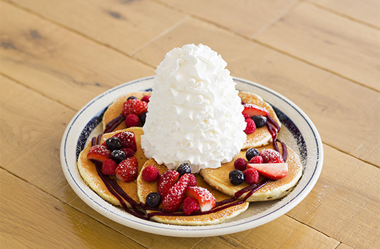 いちご・ブルーベリー・ラズベリーを盛り付け、甘酸っぱいベリーソースで仕上げたパンケーキ