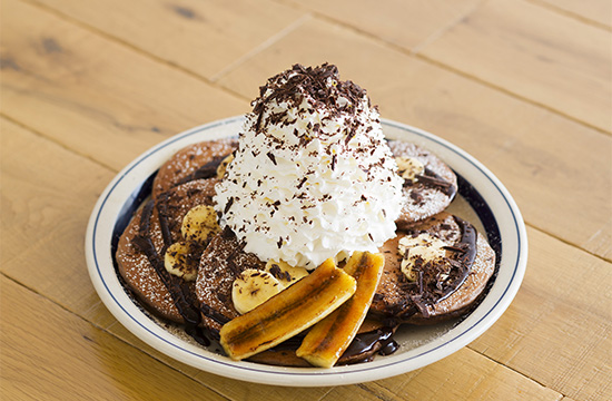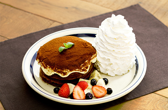 チョコレートを練り込んだ生地にマスカルポーネクリームをたっぷりかけた女性に人気のパンケーキ